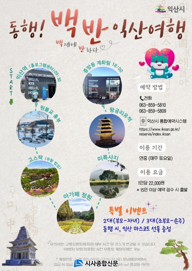 ¹é¹Ý ¿©ÇàÀº '¹éÁ¦¿¡ ¹ÝÇÏ´Ù'¶ó´Â Àǹ̷Π¹éÁ¦ ¿ª»ç µµ½Ã ÀÍ»êÀÇ ¹®ÈÀç ¹Ì¸¤»çÁö, ¿Õ±Ã¸® À¯ÀûÀ» ³Î¸® ¾Ë¸®±â À§ÇØ ÁغñÇÑ ½ÃƼÅõ¾î »óǰÀÌ´Ù. ¸ÅÁÖ Åä¿äÀÏ ¿ÀÀü 09:30 Àͻ꿪 ³» Ȧ·Î±×·¥ ¼¾ÅÍ¿¡¼ ½ÃÀÛÇØ ¿øºÒ±³ ÃѺÎ, °í½º¶ô, ¾Æ°¡ÆäÁ¤¿ø, ±¹¸³ ÀÍ»ê¹Ú¹°°ü(¹Ì¸¤»çÁö À¯Àû Æ÷ÇÔ), ¿Õ±Ã¸®À¯ÀûÀ» ¹æ¹®Çϰí Áß¾Óµ¿ °èȸ² ¾Õ¿¡¼ ¸¶¹«¸®ÇÑ´Ù.