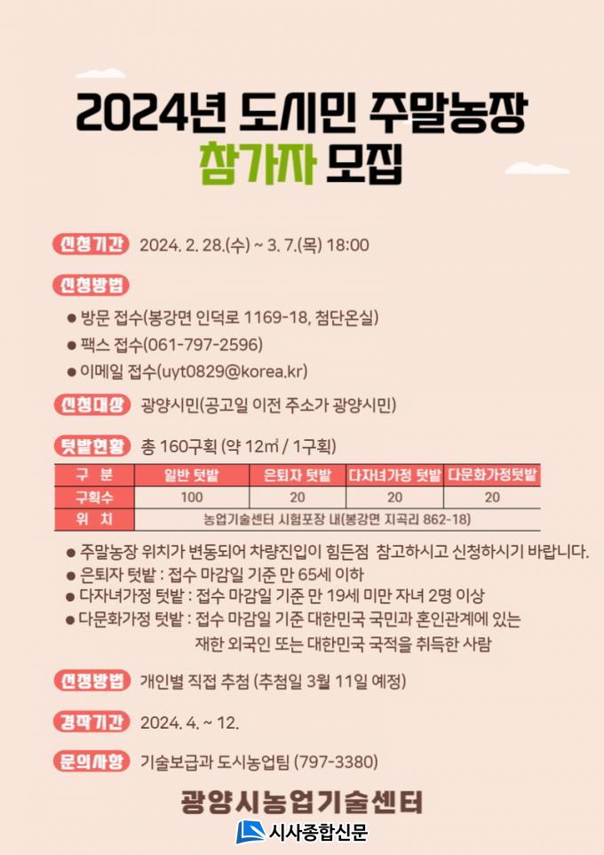 ´Ù¸¸, ´ë»óÀÚ ¼±Á¤Àº ÀÛ³â°ú ´Ù¸£°Ô 2024³â ½Å±Ô½ÅûÀÚ¸¦ ¿ì¼± ¹èÁ¤Çϰí, 2023³â ÁÖ¸»³óÀå ÀÌ¿ëÀÚ´Â ÈļøÀ§·Î ¹èÁ¤ÇÒ °èȹÀ̰í, ±âŸ ÀÚ¼¼ÇÑ »çÇ×Àº ±¤¾ç½Ãû ȨÆäÀÌÁö °ø°í¸¦ Âü°íÇÏ¸é µÈ´Ù.