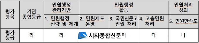 ±¸Ã¼ÀûÀ¸·Î 2022³â 9¿ùºÎÅÍ 2023³â 8¿ù±îÁö ÃßÁøÇÑ ¹Î¿ø ¼ºñ½º ½ÇÀûÀ» ´ë»óÀ¸·Î ¡â°íÃæ¹Î¿ø ó¸® ¡â±¹¹Î½Å¹®°í ¹Î¿ø ó¸® ¡â¹Î¿øÇàÁ¤ Àü·«¡¤Ã¼°è ¡â¹Î¿øÁ¦µµ ¿î¿µ ¡â¹Î¿ø¸¸Á·µµ µî 5°³ ºÐ¾ß 20°³ ÁöÇ¥¿¡ µû¶ó Æò°¡¸¦ ÁøÇàµÆÀ¸¸ç, ºÐ¾ßº° Á¡¼ö¸¦ Á¾ÇÕ Æò°¡ÇØ 5°³ µî±ÞÀ¸·Î ºÐ·ùÇß´Ù.