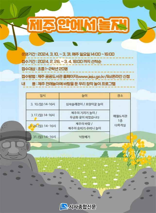 ¸ðÁý ÀοøÀº ÃʵîÇб³ 1~2Çгâ 20¸íÀ̰í, Á¢¼ö ±â°£Àº 2¿ù 26ÀϺÎÅÍ 3¿ù 4ÀϱîÁöÀÌ´Ù. Âü¿©¸¦ Èñ¸ÁÇÏ´Â ¾î¸°ÀÌ´Â 2¿ù 26ÀϺÎÅÍ Á¦ÁÖÆ¯º°ÀÚÄ¡µµ °ø°øµµ¼°ü ´©¸®Áý(https://www.jeju.go.kr/lib)ÀÇ Çà»ç/ÇÁ·Î±×·¥¿¡¼ ½ÅûÇÏ¸é µÈ´Ù.
