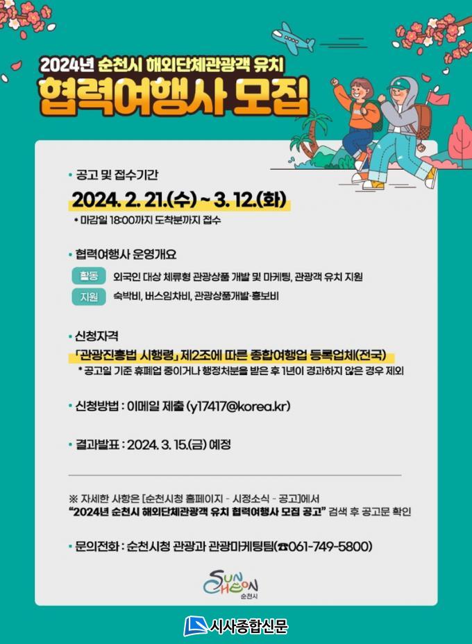 | ¼øÃµ½Ã, ¡®2024³â ÇØ¿Ü´Üü°ü±¤°´ À¯Ä¡ Çù·Â¿©Çà»ç¡¯ ¸ðÁý ±Û·Î¹ú °ü±¤µµ½Ã µµ¾àÀ» ÇÔ²²ÇÒ Çù·Â¿©Çà»ç¸¦ ã´Ù