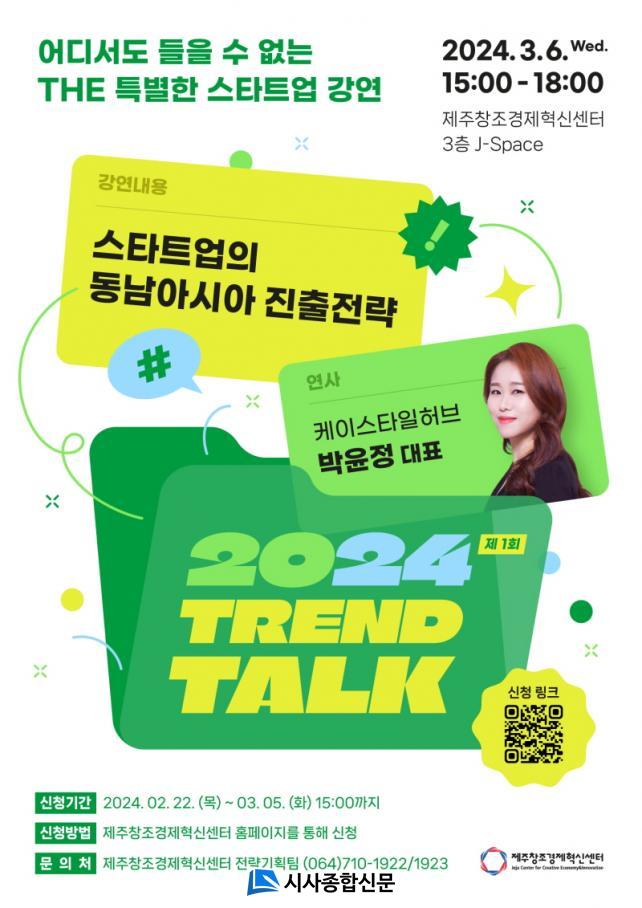 2024³â Á¦1ȸ TREND TALK ÇÁ·Î±×·¥Àº ³»´Þ 6ÀÏ ¿ÀÈÄ 3½Ã Á¦ÁÖº¥Ã³¸¶·ç 3Ãþ J-Space¿¡¼ ¿¸®¸ç, À̹ø Çà»çÀÇ ÃÊû ¿¬»ç·Î ÄÉÀ̽ºÅ¸ÀÏÇãºêÀÇ ¹ÚÀ±Á¤ ´ëÇ¥°¡ Âü¼®ÇÒ ¿¹Á¤ÀÌ´Ù.