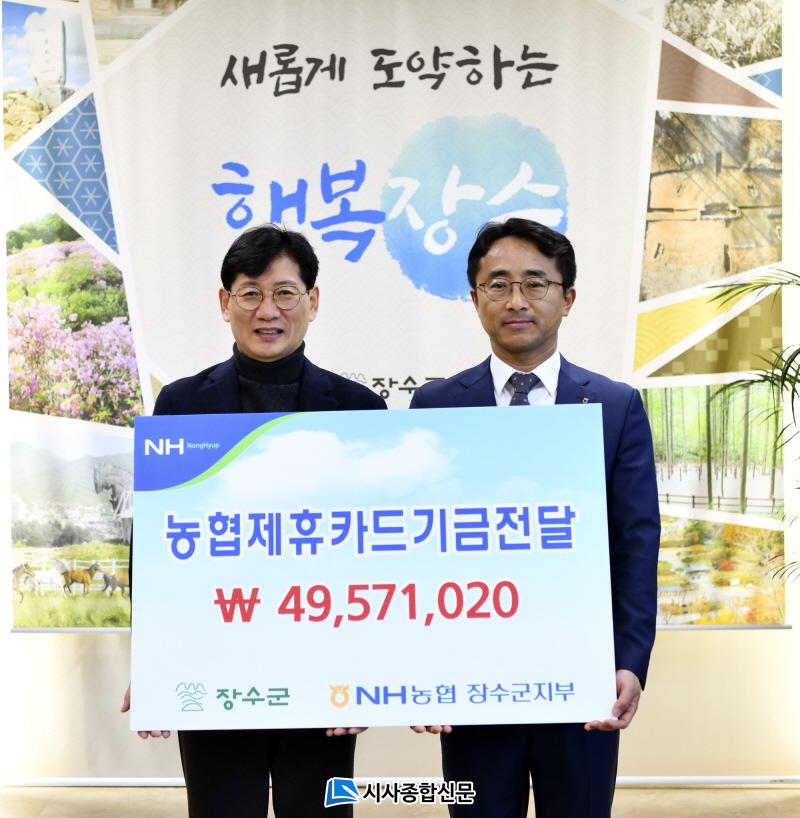 ¡®Á¦ÈÞÄ«µå Àû¸³±â±Ý¡¯Àº NH³óÇùÀºÇà°ú Àå¼ö±º °£ °øµ¿ Çù¾à¿¡ µû¶ó Áö³ÇØ 1³â°£ Àå¼ö±ºÃ» ¹ýÀÎÄ«µå, °ø¹«¿ø º¹ÁöÄ«µå¿Í º¸Á¶±Ý Àü¿ëÄ«µå »ç¿ë¾×ÀÇ 0.2~1.0%¸¦ Àå¼ö±º ¹ßÀü ±â±ÝÀ¸·Î Àû¸³ÇÑ °ÍÀ¸·Î 49,571,020¿øÀ» Àü´ÞÇß´Ù.