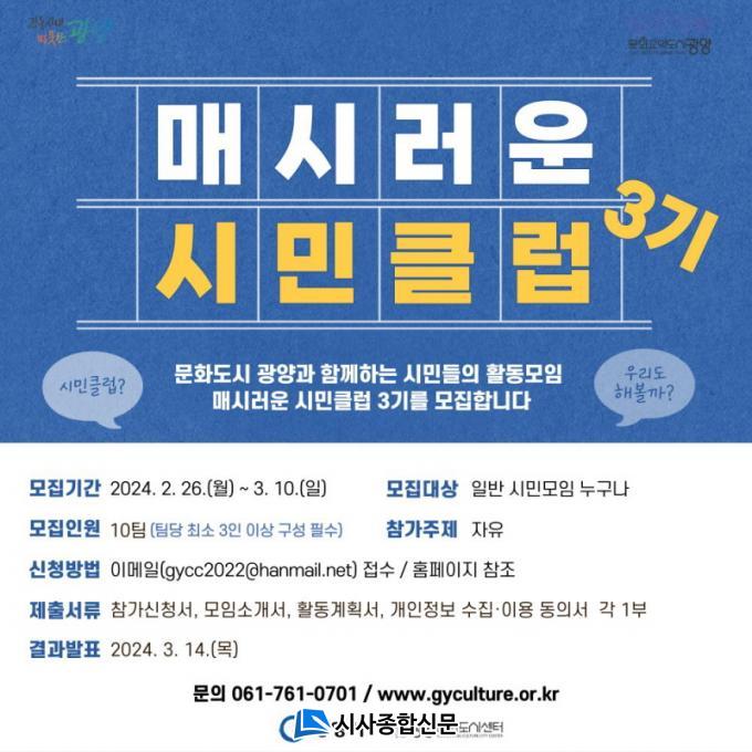 ¸Å½Ã·¯¿î ½Ã¹ÎŬ·´ 3±â´Â 3¿ù 10ÀÏ(ÀÏ)±îÁö À̸ÞÀÏ·Î ½ÅûÀ» ¹Þ°í, ¼·ù ½É»ç¸¦ °ÅÃÄ 3¿ù 14ÀÏ(¸ñ)¿¡ ÃÖÁ¾ Âü°¡ÆÀÀ» ¹ßÇ¥ÇÒ ¿¹Á¤ÀÌ´Ù. ÀÌ¿Í °ü·ÃÇÑ ÀÚ¼¼ÇÑ ³»¿ëÀº ±¤¾ç¹®Èµµ½Ã¼¾ÅÍ È¨ÆäÀÌÁö(www.gyculture.or.kr)¿¡¼ È®ÀÎÇÒ ¼ö ÀÖ´Ù.