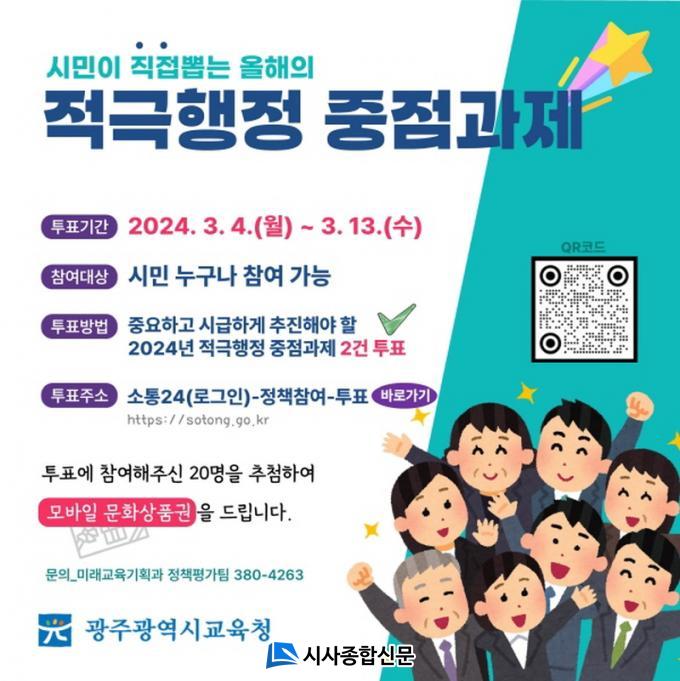 3ÀÏ ±¤Áֽñ³À°Ã»¿¡ µû¸£¸é 2024³â Àû±ØÇàÁ¤ ÁßÁ¡°úÁ¦·Î 7°Ç »ç¾÷¿¡ ´ëÇÑ ¿Â¶óÀÎ ÅõÇ¥¸¦ ½Ç½ÃÇÑ´Ù. À̸¦ ÅëÇØ ÁßÁ¡°úÁ¦ 2°ÇÀ» ÃÖÁ¾ ¼±Á¤ÇÏ°í ¿ì¼± ÃßÁøÇÔÀ¸·Î½á ½Ã¹ÎÀÌ Ã¼°¨ÇÒ ¼ö ÀÖ´Â ¼º°ú¸¦ âÃâÇÑ´Ù´Â ¹æÄ§ÀÌ´Ù.