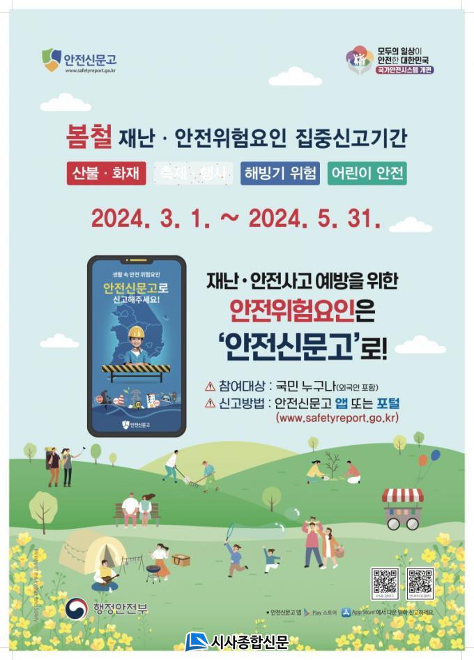 ÁýÁß½Å°í ±â°£¿¡´Â ¾ÈÀü½Å¹®°í ¾Û¿¡¼ ¡®ÁýÁß½Å°í ¹Ù·Î°¡±â¡¯ ¹× ¡®Äü¸Þ´º¡¯ÀÇ ÁýÁß ½Å°í ±â´ÉÀ» Ȱ¿ëÇØ ¼Õ½±°Ô ½Å°íÇÒ ¼ö ÀÖ´Ù. À̹ø º½Ã¶ ÁýÁß ½Å°í ´ë»óÀº ¡ãºÒ¹ý ¼Ò°¢ µî »êºÒ¡¤ÈÀç ¡ãÀÎÆÄ ¹ÐÁý µî ÃàÁ¦¡¤Çà»ç ¡ãºØ±«, ³«¼® µî ÇØºù±â À§Çè ¡ãÅëÇзÎ, ³îÀ̽ü³ µî ¾î¸°ÀÌ ¾ÈÀü ÃÑ 4°³ À¯ÇüÀÌ´Ù.