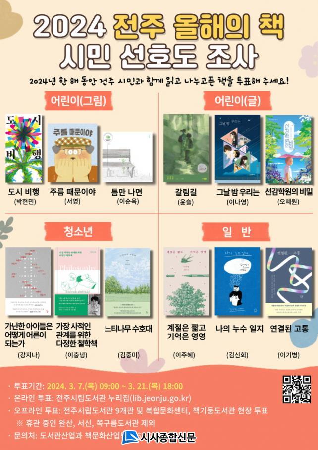 ÀüÁֽô ¿À´Â 21ÀϱîÁö ½Ã¹ÎµéÀÌ 1³â µ¿¾È ÇÔ²² ÀÐ°í °ø°¨ÇÒ ¼ö ÀÖ´Â ¡®2024 ÀüÁÖ ¿ÃÇØÀÇ Ã¥¡¯À» ¼±Á¤Çϱâ À§ÇÑ ½Ã¹Î ¼±È£µµ Á¶»ç¸¦ ½Ç½ÃÇÑ´Ù°í 6ÀÏ ¹àÇû´Ù.