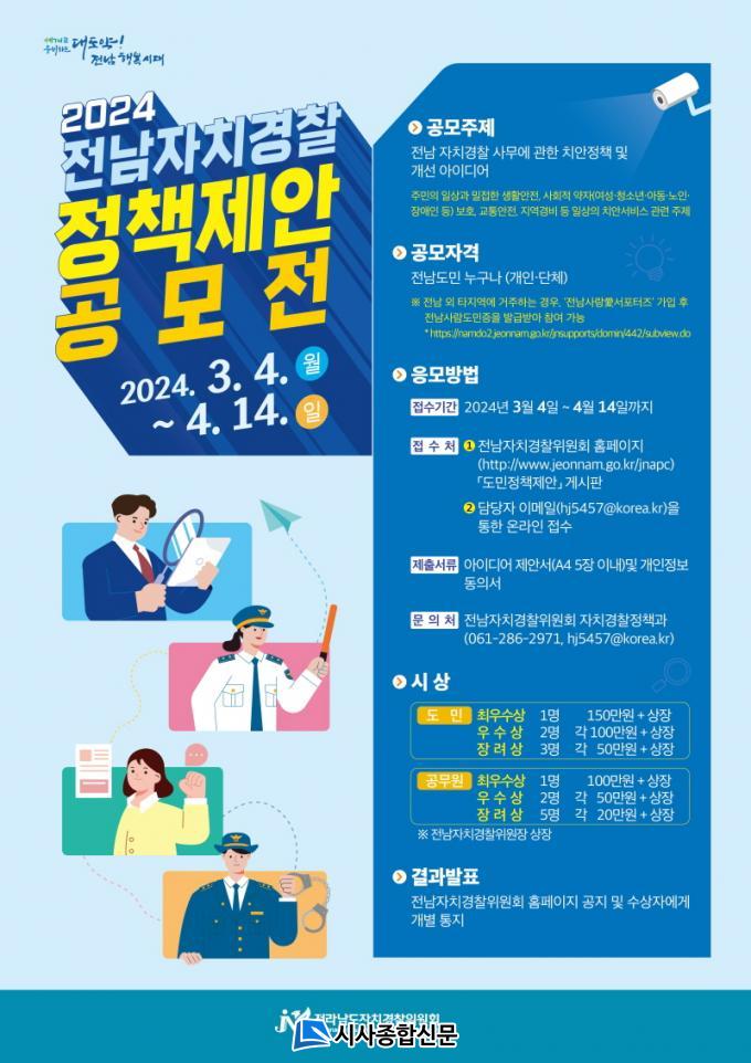 À̹ø °ø¸ð¿¡ ¼±Á¤µÈ ¿ì¼ö Á¦¾Èµµ °ü·Ã ºÎ¼ °ËÅä ¹× ½Ç¹«ÇùÀÇȸ µîÀ» ÅëÇØ Ä¡¾È Á¤Ã¥ ¼ö¸³ÀÇ ¼ÒÁßÇÑ ÀÚ·á·Î Ȱ¿ëÇÒ ¿¹Á¤ÀÌ´Ù. ÀÚ¼¼ÇÑ »çÇ×Àº Àü³²µµ ¹× Àü³²µµÀÚÄ¡°æÂûÀ§¿øÈ¸ ´©¸®ÁýÀ» Âü°íÇϰųª ÀÚÄ¡°æÂûÁ¤Ã¥°ú(061-286-2971)·Î ¹®ÀÇÇÏ¸é µÈ´Ù.
