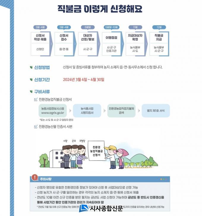 Áö±Þ ´ë»óÀº »ç¾÷ ±â°£(2023³â 11~2024³â 10¿ù) ģȯ°æÀÎÁõÀ» À¯ÁöÇϰí 5¿ù¿¡¼ 10¿ù±îÁö ģȯ°æ³ó¾÷ ½Çõ Áؼö»çÇ× ÀÌÇà ¿©ºÎ¸¦ ÀÎÁõ±â°üÀÌ Á¡°ËÇØ ÀûÇÕÀ¸·Î Å뺸¹ÞÀº °æ¿ì´Ù. 12¿ù¿¡ Á÷ºÒ±ÝÀ» Áö±ÞÇÒ °èȹÀÌ´Ù.´Ù¸¸ »ç¾÷ ±â°£ ³» ģȯ°æÀÎÁõ ±â°£ÀÌ ¸¸·á ¿¹Á¤ÀÎ ³ó¾÷ÀÎÀº ÀÎÁõÀÌ ¸¸·áµÇ±â 2°³¿ù Àü¿¡ °»½Å ½ÅûÀ» ÇØ¾ß Çϰí, °»½ÅµÇÁö ¾ÊÀ¸¸é Á÷ºÒ±ÝÀÌ Áö±ÞµÇÁö ¾Ê´Â´Ù.