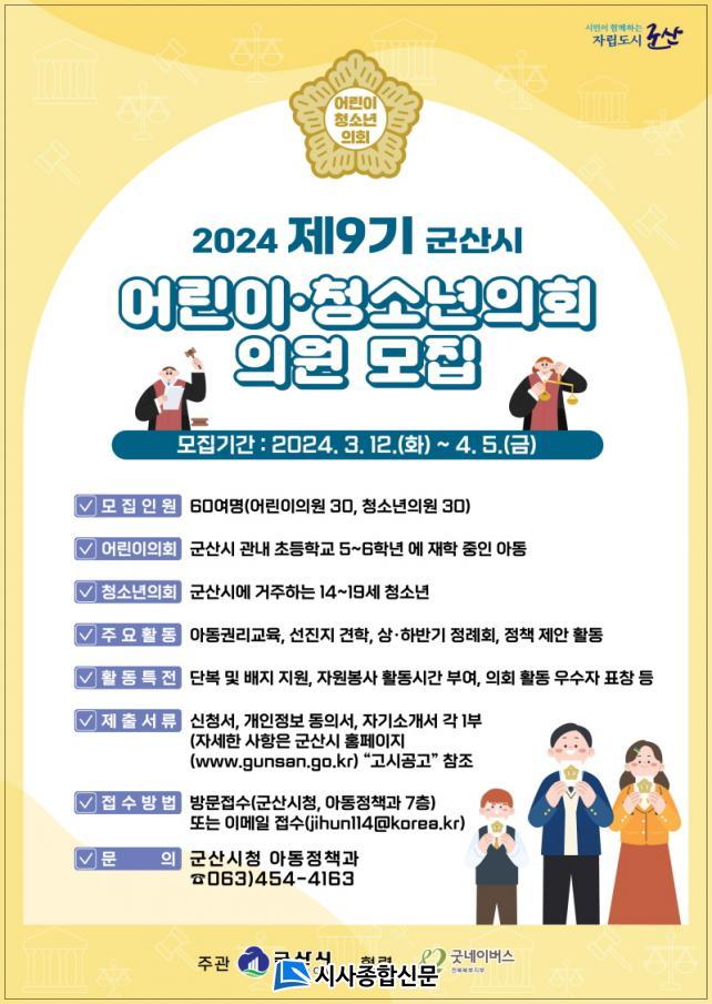 [½Ã»çÁ¾ÇսŹ® = ±è¿¬Èñ ±âÀÚ] ±º»ê½Ã´Â 12ÀÏ(È)ºÎÅÍ 4¿ù 5ÀÏ(±Ý)±îÁö ¿ÃÇØ·Î Á¦9±â¸¦ ¸Â´Â ±º»ê½Ã ¾î¸°ÀÌ․û¼Ò³âÀÇȸ¸¦ À̲ø¾î°¥ ¾î¸°ÀÌ.û¼Ò³âÀÇ¿øÀ» °ø°³¸ðÁý ÇÑ´Ù.