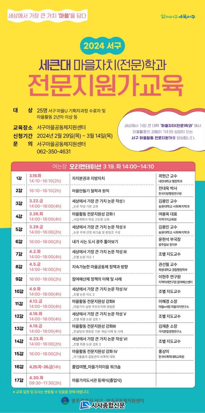 À̹ø ±³À°Àº ¸¶À»È°µ¿°¡ ¿ª·®°È¸¦ ÅëÇÑ ¸¶À»°øµ¿Ã¼ ¼ºÀåÀ» À§ÇØ 4¿ù 30ÀϱîÁö ¡ã¸¶À»°øµ¿Ã¼ Á¤Ã¥°ú ¹æÇâ ¹× ¸¶À»¸¸µé±â °¡Ä¡ öÇÐ ÀÌÇØ ¡ã¸¶À»È°µ¿ Àü¹®Áö¿ø ¿ª·®°È(ÄÁ¼³ÆÃ°ú ¸àÅ丵 ±â¹ý, ÁÖ¹ÎÁ¶Á÷È ¹æ¹ý·Ð, »ç¾÷°èȹ¼ ÀÛ¼º¹ý, °¥µî°ü¸®) ¡ã¼¼»ó¿¡¼ °¡Àå Å« °¡Ä¡¡®¸¶À»¡¯³í¹® Áöµµ ¡ãÁ¹¾÷¿©Çà ¸¶À»°¡Ä¡ÀÌÀ½ ¿öÅ©¼ó ¡ã¸¶À»°¡Ä¡µµ¼°ü µîÀç½Ä µî ÃÑ 17°À¸·Î ÁøÇàµÈ´Ù.