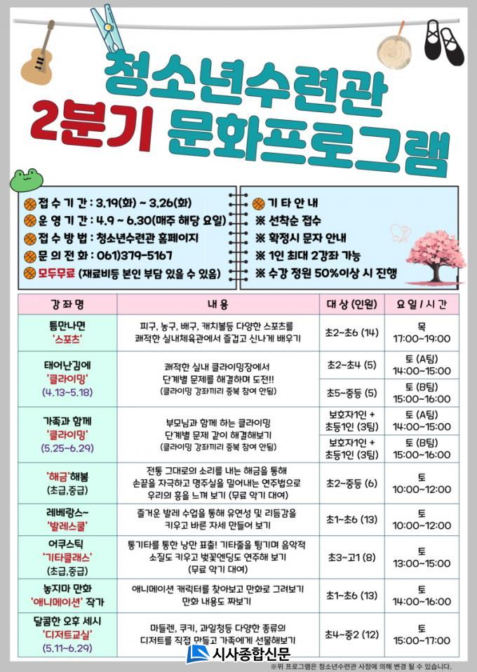 ¿ì¸® Áö¿ª¿¡¼ û¼Ò³âµéÀÇ °Ç°ÇÏ°í ±ÕÇü ÀÖ´Â ¼ºÀåÀ» À§ÇØ ÁøÇàµÇ´Â ¹®ÈÇÁ·Î±×·¥Àº û¼Ò³â¼ö·Ã°ü ÀÌ¿ëÀÚÀÇ ´Ù¾çÇÑ ÀǰßÀ» ¹Ý¿µÇØ Ã»¼Ò³â°ú ±× °¡Á·À» ´ë»óÀ¸·Î ¹®È¡¤¿¹¼ú¡¤¿ä¸®¡¤½ºÆ÷Ã÷ µî 8°³ °Á¸¦ ÁøÇàÇÑ´Ù.