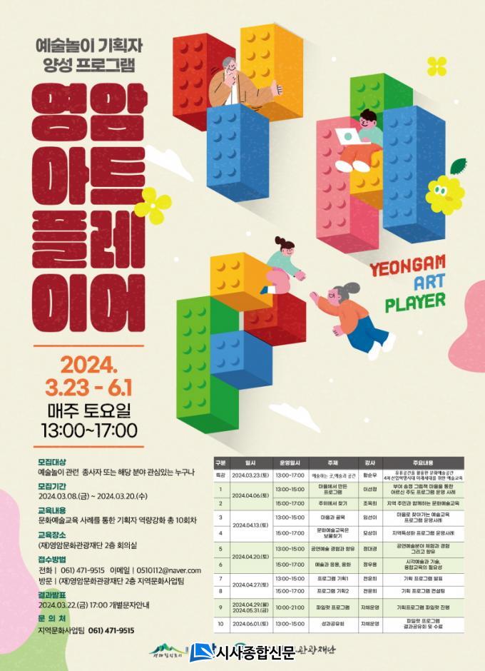 À̹ø ±³À°Àº ¿À´Â 3¿ù 23ÀϺÎÅÍ 6¿ù 1ÀϱîÁö ¸ÅÁÖ Åä¿äÀÏ ¿ÀÈÄ1½ÃºÎÅÍ 5½Ã±îÁö 4½Ã°£ ÃÑ 10ȸÂ÷·Î ÁøÇàµÇ¸ç ¡ã¿¹¼úÀÇ °ø°£°ú ³îÀÌ ¡ãÁö¿ªÁÖ¹ÎÀÌ ¸¸µé¾î°¡´Â ¹®È¿¹¼ú±³À° ¡ã¿¹¼ú ÇÁ·Î±×·¥ »ç·Ê °øÀ¯ ¡ãÇÁ·Î±×·¥ ÄÁ¼³ÆÃ ¡ã¿µ¾Ï ¿¹¼ú³îÀÌ Å°¿öµå ¹ß±¼ ¡ã¿¹¼ú³îÀÌ ÆÄÀÏ·µ µîÀÇ ÇÁ·Î±×·¥À¸·Î ¿î¿µµÉ ¿¹Á¤ÀÌ´Ù.