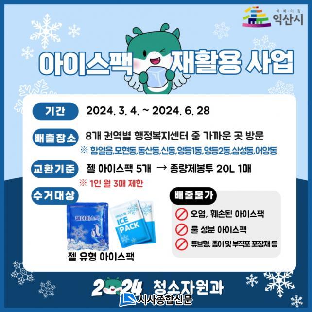 ÀÍ»ê½Ã´Â Àç»ç¿ëÀÌ °¡´ÉÇÑ Á© ¾ÆÀ̽ºÆÑ 5°³¸¦ 20§¤ Á¾·®Á¦ ºÀÅõ 1¸Å·Î ±³È¯ÇØ ÁÖ´Â ¾ÆÀ̽ºÆÑ ÀçȰ¿ë »ç¾÷À» ÁøÇàÇÑ´Ù. ¾ÆÀ̽ºÆÑ ±³È¯ Àå¼Ò´Â ÇÔ¿À¾, ¸ðÇöµ¿, µ¿»êµ¿, »ï¼ºµ¿, ¾î¾çµ¿, ¿µµî1µ¿, ¿µµî2µ¿, ½Åµ¿ µî 8°³ ÇàÁ¤º¹Áö¼¾ÅÍÀÌ´Ù.