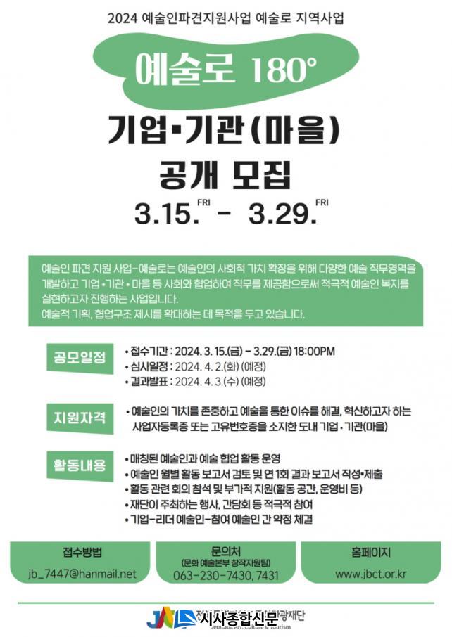 [½Ã»çÁ¾ÇսŹ® = ±è¿¬Èñ ±âÀÚ] ÀüºÏƯº°ÀÚÄ¡µµ¹®È°ü±¤Àç´Ü(´ëÇ¥ÀÌ»ç À̰æÀ±, ÀÌÇÏ Àç´Ü)ÀÌ ¡®2024 ¿¹¼úÀÎÆÄ°ßÁö¿ø»ç¾÷ ¿¹¼ú·Î Áö¿ª»ç¾÷-¿¹¼ú·Î 180¡Æ¡¯¿¡ Âü¿© ÇÒ ±â¾÷¡¤±â°ü(¸¶À»)ÀÇ °ø°³ ¸ðÁýÀ» 3¿ù 15ÀÏ(±Ý)ºÎÅÍ 15ÀÏ °£ ÁøÇàÇÑ´Ù.