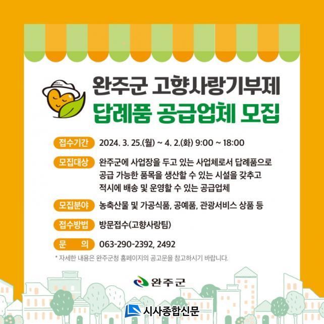 °ø¸ð Á¢¼ö ±â°£Àº ¿À´Â 25ÀϺÎÅÍ 4¿ù 2ÀϱîÁöÀ̸ç, ´ä·Êǰ °ø±ÞÀ» ¿øÇÏ´Â ¾÷ü´Â ¿ÏÁÖ±ºÃ» °æÁ¦½Äǰ°ú °íÇâ»ç¶ûÆÀÀ¸·Î ¹æ¹®ÇØ ½Åû ¼·ù¸¦ Á¢¼öÇÏ¸é µÈ´Ù.