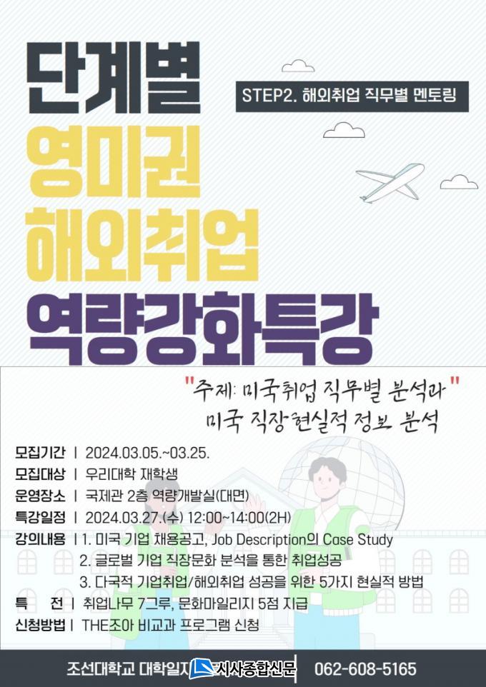 [½Ã»çÁ¾ÇսŹ® = ±è¿¬Èñ ±âÀÚ] Á¶¼±´ëÇб³ ´ëÇÐÀÏÀÚ¸®Ç÷¯½º¼¾ÅͰ¡ ¿À´Â 20ÀÏ, 27ÀÏ 2Â÷·Ê ¿µ¹Ì±Ç ÇØ¿ÜÃë¾÷ Ư°À» °³ÃÖÇÑ´Ù.