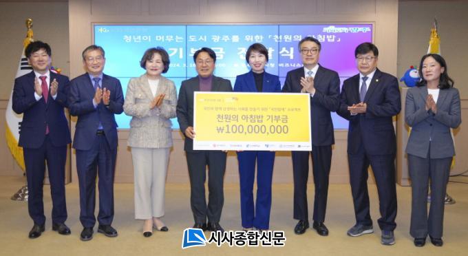 ±¤ÁÖ±¤¿ª½Ã(½ÃÀå °±âÁ¤)´Â 18ÀÏ ½Ãû ºñÁî´Ï½º·ë¿¡¼ °±âÁ¤ ½ÃÀå, ³ëÇöÁÖ KB±¹¹ÎÀºÇà È£³²Áö¿ª±×·ì´ëÇ¥, ±èº´ÀÎ Àü³²´ë ºÎÃÑÀå, ÀüÁ¦¿ Á¶¼±´ë ºÎÃÑÀå, ¹Ú»óö È£³²´ë ÃÑÀå, À̼±Àç ±¤ÁÖ¿©´ë ÃÑÀå, ¼Û¹Ì·É ±¤ÁÖ°úÇбâ¼ú¿ø ÇлýóÀå µîÀÌ Âü¼®ÇÑ °¡¿îµ¥ ¡®Ãµ¿øÀÇ ¾ÆÄ§¹ä ±âºÎ±Ý Àü´Þ½Ä¡¯À» °¡Á³´Ù.