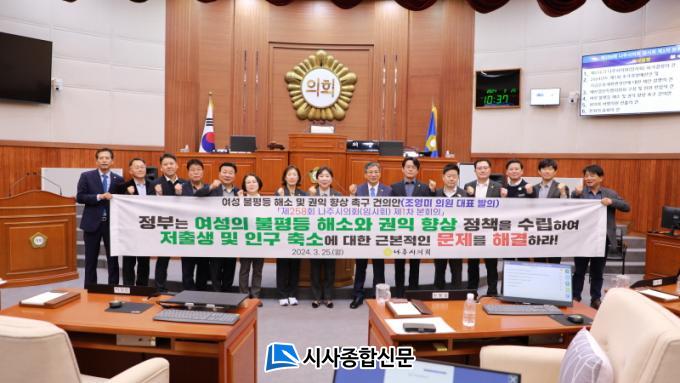 ³ªÁÖ½ÃÀÇȸ´Â °ÇÀǾÈÀ» ÅëÇØ ¡ãÁ¤ºÎ´Â ¿©¼ºÀÇ ºÒÆòµî ÇØ¼Ò¿Í ±ÇÀÍ Çâ»óÀ» À§ÇÑ Á¤Ã¥À» ¼ö¸³ÇÏ¿© ÀúÃâ»ý ¹× Àα¸Ãà¼Ò¿¡ ´ëÇÑ ±Ùº»ÀûÀÎ ¹®Á¦¸¦ ÇØ°áÇÒ °Í ¡ã¼ºÆòµî ½ÇÇöÀ» À§ÇÑ ½ÇÁúÀûÀÎ ´ëÃ¥À» ¸¶·ÃÇÒ °ÍÀ» Á¦¾ÈÇß´Ù.