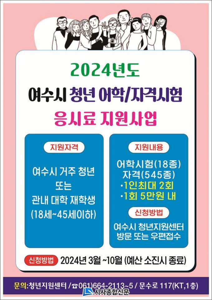 Áö¿ø ´ë»óÀº 18¼¼¿¡¼ 45¼¼ û³âÀ¸·Î, ¿©¼ö½Ã¿¡ Áֹεî·ÏÀ» µÎ°Å³ª °ü³» ¼ÒÀç ´ëÇб³¿¡ ÀçÇÐ ÁßÀÎ ÇлýÀÌ¿©¾ß ÇÑ´Ù. Áö¿ø±âÁØÀº 2024³â¿¡ ÀÀ½ÃÇÑ ¾îÇнÃÇè 18Á¾(ÅäÀÍ µî), ÀڰݽÃÇè 545Á¾(±¹°¡±â¼úÀڰݹý ½ÃÇà±ÔÄ¢¿¡ µû¸¥ ÀڰݽÃÇè)À̸ç, 2023³â 12¿ù ¾îÇÐ ÀÀ½Ã °Çµµ ¼Ò±Þ Áö¿øÇÑ´Ù. 1Àδç 1ȸ 5¸¸ ¿ø À̳» 2ȸ±îÁö, ¿ÃÇØ »ç¾÷·®ÀÎ 380ȸÀÇ ¿¹»ê ¼ÒÁø ½Ã±îÁö Áö¿øµÈ´Ù.
