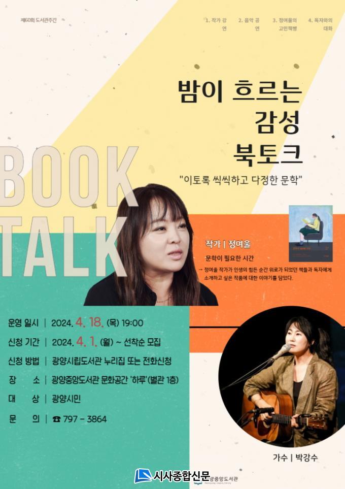 Á¤ ÀÛ°¡´Â À̹ø ºÏ ÅäÅ©¸¦ ÅëÇØ »çȸÀû °¡¸é¿¡ ÁöÄ£ ³ª¸¦ À§·ÎÇÏ°í ³» ¾ÈÀÇ ÀÒ¾î¹ö¸° °¡´É¼ºÀ» ¸¶ÁÖÇØ »õ·Î¿î »îÀÇ ½Ç¸¶¸®¸¦ ã°Ô µÉ °ÍÀ̶ó°í ÀüÇß´Ù. ¶ÇÇÑ, ´Ü¾ÆÇÑ À½»ö°ú ±íÀº °¨¼ºÀ¸·Î ¡®¿©ÀÚ ±è±¤¼®¡¯À̶ó´Â º°¸íÀ» ¾òÀº °¡¼ö ¹Ú°¼ö°¡ ¿¬ÁÖÇÏ´Â µû¶æÇÑ Åë±âŸ ¼±À²°ú ¼Á¤ £Àº ¶óÀÌºê °ø¿¬µµ ÁغñµÅ ÀÖÀ¸¸ç, Á¤¿©¿ï ÀÛ°¡¿Í ÇÔ²²ÇÏ´Â °í¹Î »ó´ã¼Ò, Âü¿©ÀÚ¿Í ÀÛ°¡°¡ ÇÔ²² ¼ÒÅëÇÏ´Â ÁúÀÇÀÀ´ä ½Ã°£µµ ¸¶·ÃµÆ´Ù.
