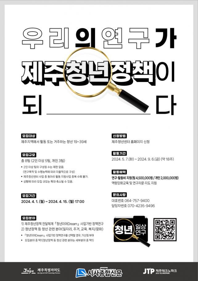 [½Ã»çÁ¾ÇսŹ® = °í¼º¹Î ±âÀÚ] Á¦ÁÖÆ¯º°ÀÚÄ¡µµ¿Í Á¦ÁÖû³â¼¾ÅÍ(Á¦ÁÖTP»êÇÏ)°¡ û³âµéÀÇ »îÀ» µé¿©´Ùº¸°í ¿¬±¸Çغ¸°í ½ÍÀº û³âµéÀ» À§ÇØ¡¸Á¦ÁÖû³âÁ¤Ã¥ ¿¬±¸ °ø¸ð»ç¾÷: û³âÀϻ󿬱¸¡¹Âü¿©ÀÚ¸¦ 4¿ù 1ÀÏ(¿ù)ºÎÅÍ 4¿ù 15ÀÏ(¿ù)±îÁö(15Àϰ£) ¸ðÁýÇÑ´Ù.