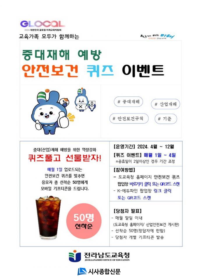 À̺¥Æ®´Â 4¿ùºÎÅÍ 12¿ù±îÁö ¿î¿µÇϸç, ¸Å¿ù 1 ~ 4ÀÏ »çÀÌ ÀÀ¸ðÇÒ ¼ö ÀÖ´Ù. ÄûÁî ³»¿ëÀº Áß´ëÀçÇØÃ³¹ú¹ý ÁÖ¿ä ³»¿ë°ú Àü³²±³À°Ã» Àǹ«ÀÌÇà »çÇ× µî Áß´ë(»ê¾÷)ÀçÇØ ¿¹¹æÀ» À§ÇÑ »çÇ×µéÀÌ´Ù.