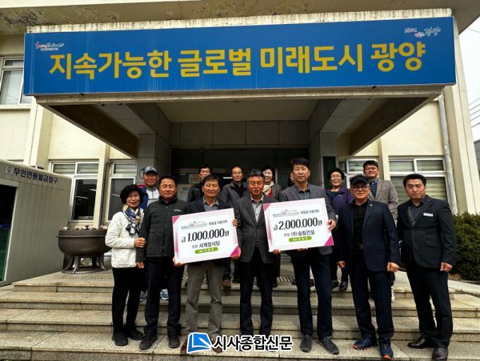 ÇÑÆí, À̳¯ ȸÀÇ¿¡ ¾Õ¼ ¢ß½Â¸²°Ç¼³ ¾ç½Â°ï ´ëÇ¥, »ç°èÀý½Ä´ç ±èÁ¾È£ ´ëÇ¥°¡ Áö¿ª¹ÎÀ» À§ÇØ ÈÄ¿ø±Ý °¢°¢ 2¹é¸¸¿ø°ú 1¹é¸¸¿øÀ» ±âŹÇß´Ù.