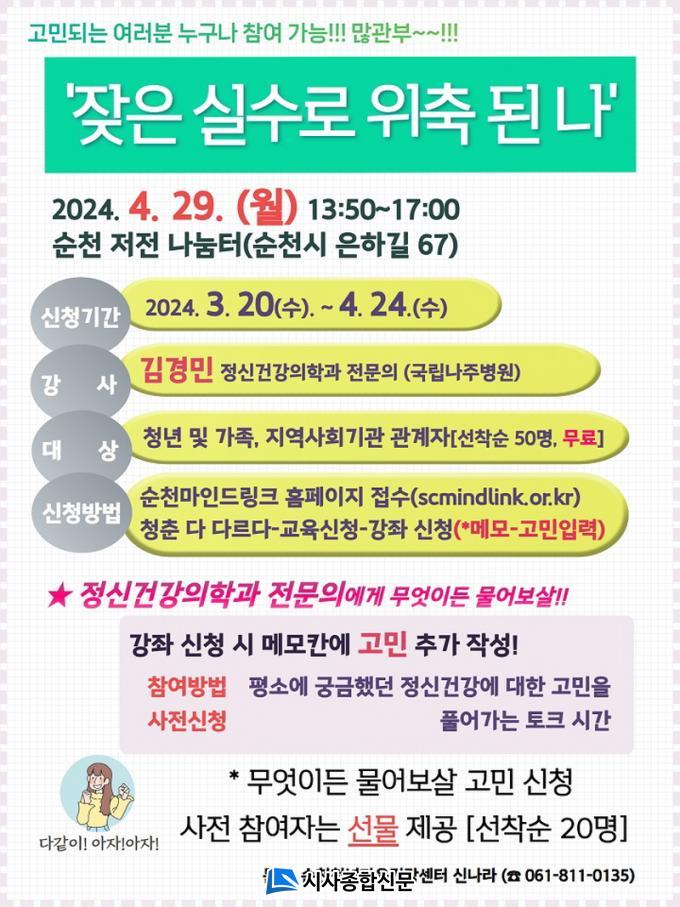 °Á´ ´©±¸³ª ¹«·á·Î Âü¿©ÇÒ ¼ö ÀÖ°í ½ÅûÀº ¿À´Â 24ÀϱîÁö Æ÷½ºÅÍ(QRÄÚµå)¿Í ¼øÃµ¸¶Àε帵ũ ȨÆäÀÌÁö(www.scmindlink.or.kr)¸¦ ÅëÇØ ¼±Âø¼øÀ¸·Î 50¸í±îÁö ½Åû¹ÞÀ» ¿¹Á¤ÀÌ´Ù.