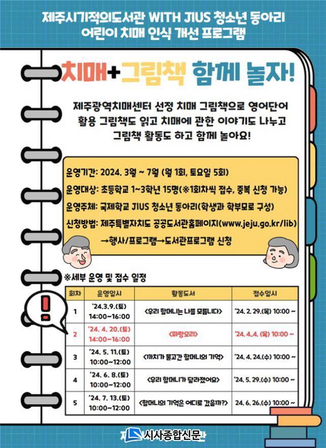 4¿ù¿¡´Â ±×¸²Ã¥ <ÆÄ¶û ¿À¸®>¸¦ Àаí Ä¡¸Å¸¦ ÀÌÇØÇØ º¸´Â ½Ã°£À» °¡Áú ¿¹Á¤À̸ç, Âü¿©ÀÚ Á¢¼ö´Â 4. 4.(¸ñ) ¿ÀÀü 10½ÃºÎÅÍ Á¦ÁÖÆ¯º°ÀÚÄ¡µµ °ø°øµµ¼°ü ´©¸®Áý(https://www.jeju.go.kr/lib)À» ÅëÇØ ½ÅûÇÏ¸é µÈ´Ù.