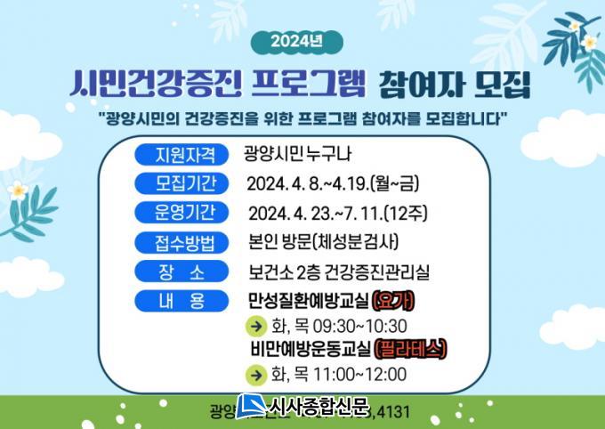 ÇÁ·Î±×·¥ Âü¿©¸¦ ¿øÇÏ´Â ½Ã¹ÎÀº ¿À´Â 8ÀÏ(¿ù)ºÎÅÍ 19ÀÏ(±Ý)±îÁö ±¤¾ç½Ãº¸°Ç¼Ò(2Ãþ) °Ç°ÁõÁø½Ç·Î ¹æ¹® ½ÅûÇÏ¸é µÈ´Ù. ü¼ººÐ °Ë»ç¸¦ À§ÇØ ¹Ýµå½Ã º»ÀÎÀÌ ¹æ¹®ÇØ¾ß ÇÑ´Ù.