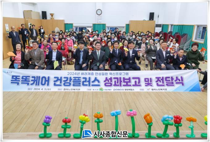 3³â° ÁøÇàµÇ´Â ¡®¶È¶ÈÄÉ¾î °Ç°Ç÷¯½º¡¯ »ç¾÷Àº ¸Å³â Æ÷½ºÄÚ1%³ª´®Àç´ÜÀÇ ÈÄ¿øÀ» ÅëÇØ ±¤¾ç¿¡ °ÅÁÖÇÏ´Â 65¼¼ ÀÌ»ó ¾î¸£½Å¿¡°Ô ½º¸¶Æ® ±â±â¸¦ Áö¿øÇØ °³ÀÎ ¸ÂÃãÇü °Ç°°ü¸® ¼ºñ½º¸¦ ü°èÀûÀ¸·Î Á¦°øÇϱâ À§ÇÑ »ç¾÷À¸·Î, ¿ÃÇØ´Â 95¸íÀÇ Âü¿©ÀÚ¸¦ ¸ðÁýÇÑ´Ù.