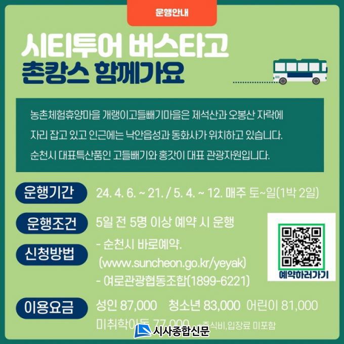 ¼øÃµ½ÃƼÅõ¾î ÀÌ¿ë¿ä±Ý, ¿îÇàÄÚ½º µî »ó¼¼ ³»¿ë È®Àΰú ¿Â¶óÀÎ ¿¹¾àÀº ¼øÃµ½Ã ¹Ù·Î¿¹¾à(www.suncheon.go.kr/yeyak)¿¡¼ °¡´ÉÇÏ´Ù.
