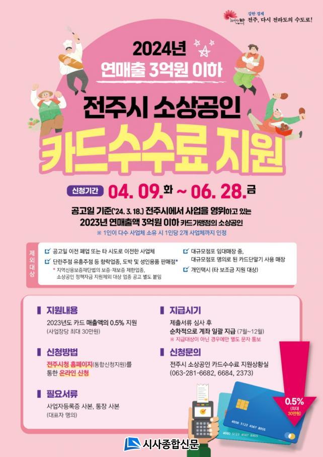 Èñ¸ÁÀÚ´Â ½Åû ±â°£ ³»¿¡ ÀüÁֽà ´©¸®Áý(www.jeonju.go.kr) ÅëÇÕ½ÅûÁö¿ø¿¡¼ »ç¾÷ÀÚµî·ÏÁõ »çº»°ú ´ëÇ¥ÀÚ¸íÀÇ ÅëÀå »çº»À» ÷ºÎÇØ ¿Â¶óÀÎÀ¸·Î °£´ÜÈ÷ ½ÅûÇÒ ¼ö ÀÖ´Ù. ¼Ò»ó°øÀÎ Ä«µå¼ö¼ö·á Áö¿ø»ç¾÷¿¡ ´ëÇÑ ÀÚ¼¼ÇÑ »çÇ×Àº ÀüÁֽà ´©¸®Áý¿¡ °Ô½ÃµÈ °ø°í¹®À» Âü°íÇÏ¸é µÈ´Ù.