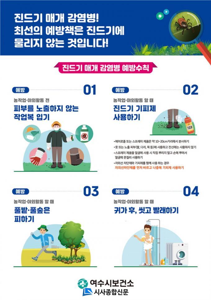 ¿¹¹æ¼öÄ¢À¸·Î´Â ¡ãÇǺθ¦ ³ëÃâÇÏÁö ¾Ê´Â ÀÛ¾÷º¹ ÀԱ⠡ãÁøµå±â ±âÇÇÁ¦ »ç¿ëÇϱ⠡ãÇ®¹ç¡¤Ç®½£Àº ÇÇÇϱ⠡ã±Í°¡ ÈÄ, ¾Ä°í »¡·¡Çϱ⠵îÀÌ ÀÖ´Ù.ÇöÀç ¿©¼ö½Ã¿¡ ½Å°í µÈ °Ç¼ö´Â ÂêÂê°¡¹«½ÃÁõ 4°Ç, ÁßÁõ¿¼ºÇ÷¼ÒÆÇ°¨¼ÒÁõÈıº(SFTS)ÀÌ 2°ÇÀ¸·Î Àα¸¿¡ ºñÇØ ¹ß»ý·üÀÌ ³ôÁö´Â ¾ÊÀ¸³ª ÁÖÀǸ¦ ¿äÇÒ Çʿ䰡 ÀÖ´Ù.