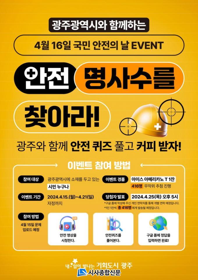À̹ø À̺¥Æ®´Â 4¿ù 16ÀÏ ±¹¹Î¾ÈÀüÀÇ ³¯À» ¸Â¾Æ ±¹¹Î¾ÈÀüÁÖ°£(4¿ù 15~21ÀÏ)¿¡ ±¤Áֽà ´©¸®Áý ¾Ë¸²Ã¢ ¡®¾ÈÀü ¸í»ç¼ö¸¦ ã¾Æ¶ó!¡¯¸¦ ÅëÇØ ±¤ÁֽùξÈÀüº¸Çè°ú ±³Åë»ç°í ¿¹¹æ Ä·ÆäÀÎ µ¿¿µ»óÀ» º¸°í °ü·Ã ¹®Á¦¸¦ Ç®¾î ±¸±Û Æû¿¡ ´äÀ» ÀÔ·ÂÇÏ¸é µÈ´Ù.