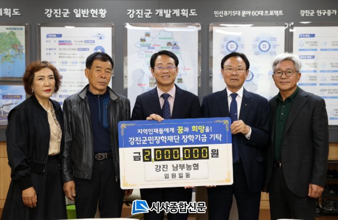 [½Ã»çÁ¾ÇսŹ® = ¿À½ÂÅà ±âÀÚ] Áö³ 4¿ù 9ÀÏ, °Áø ³²ºÎ³óÇù Ãֱ漱 Á¶ÇÕÀå°ú ÀÓÁ÷¿øµéÀÌ ÀåÇÐ±Ý 2¹é¸¸¿øÀ» °Áø±º¹ÎÀåÇÐÀç´Ü(ÀÌ»çÀå °Áø¿ø)¿¡ ±âŹÇß´Ù.