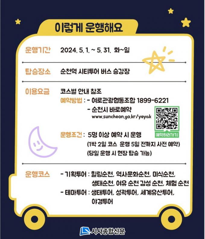 ÇÑÆí, 5¿ù 4~6ÀÏ ¾î¸°À̳¯ ¿¬ÈÞ¿¡´Â ÈÞ¹« ¾øÀÌ ¿îÇàÇÑ´Ù. ¼øÃµ½ÃƼÅõ¾î ÀÌ¿ë¿ä±Ý, ¿îÇàÄÚ½º µî »ó¼¼ ³»¿ë È®Àΰú ¿Â¶óÀÎ ¿¹¾àÀº ¼øÃµ½Ã ¹Ù·Î¿¹¾à(www.suncheon.go.kr/yeyak)¿¡¼ °¡´ÉÇÏ´Ù.