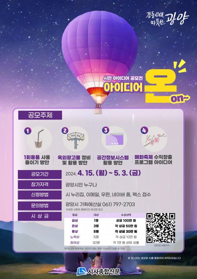 ¿ì¼öÁ¦¾ÈÀ¸·Î ¼±Á¤µÈ Á¦¾ÈÀÚ¿¡°Ô´Â ¡ã±Ý»ó(1¸í, 100¸¸ ¿ø) ¡ãÀº»ó(3¸í, 50¸¸ ¿ø) ¡ãµ¿»ó(5¸í, 30¸¸ ¿ø) ¡ã³ë·Â»ó(5¸í, 10¸¸ ¿ø)ÀÌ ÁÖ¾îÁö¸ç, ½Ã¹ÎµéÀÇ Âü¿©¸¦ µ¶·ÁÇϱâ À§ÇØ Âü¿©ÀÚ¿¡°Ôµµ Ãß÷À» ÅëÇØ 1¸¸ ¿ø »ó´çÀÇ »óǰÀ» ÁõÁ¤ÇÒ °èȹÀÌ´Ù. °ø¸ðÀü °ü·Ã ±âŸ ÀÚ¼¼ÇÑ »çÇ×Àº ±¤¾ç½Ãû ´©¸®Áý¿¡¼ È®ÀÎÇϰųª ±¤¾ç½Ã ±âȹ¿¹»ê½Ç(¢Ï061-797-2703)·Î ¹®ÀÇÇÏ¸é µÈ´Ù.