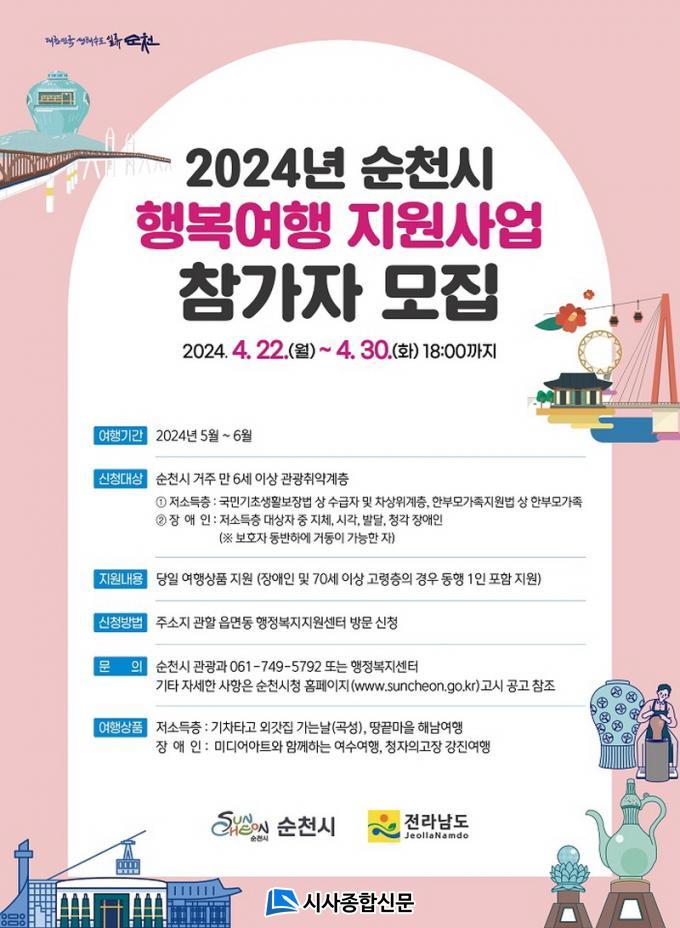 ¡®¼øÃµ½Ã Çູ¿©Çà Áö¿ø»ç¾÷¡¯Âü°¡ÀÚ ¸ðÁý¿¡ °üÇÑ ±âŸ ÀÚ¼¼ÇÑ »çÇ×Àº ¼øÃµ½Ã ȨÆäÀÌÁö °ø°í¹®À» È®ÀÎÇϰųª ¼øÃµ½Ã °ü±¤°ú(061-749-5792) ¹× ÇàÁ¤º¹Áö¼¾ÅÍ·Î ¹®ÀÇÇÏ¸é ¾È³»¹ÞÀ» ¼ö ÀÖ´Ù.