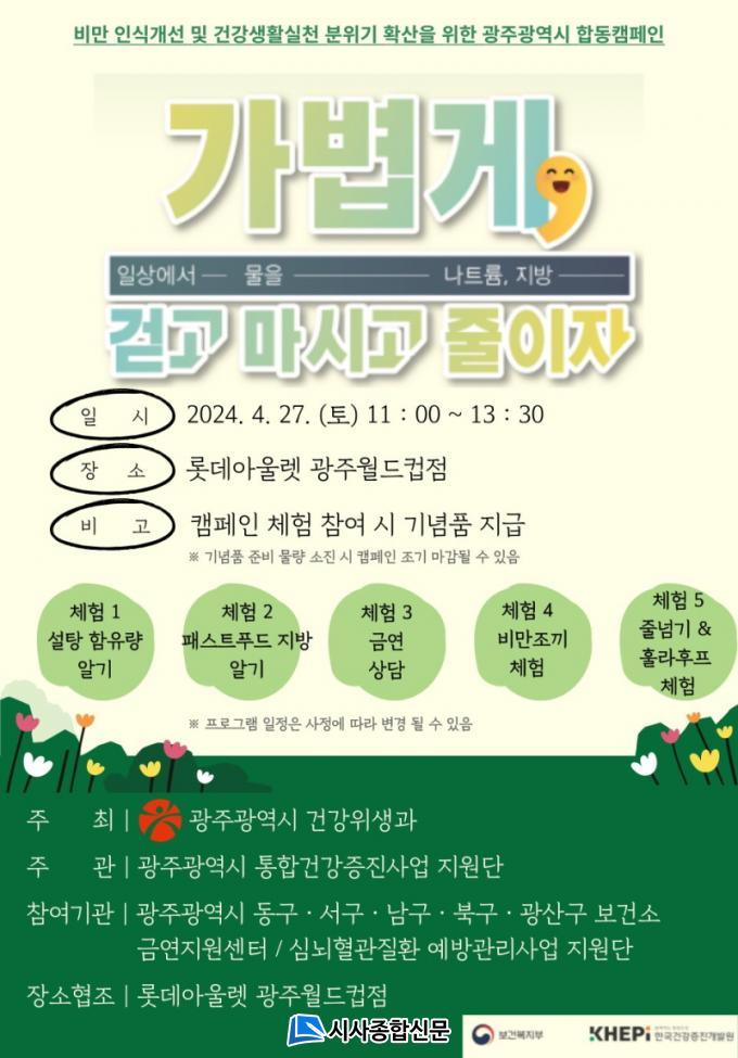±¤Áֽô ¡®ÇÏ·ç ¸¸º¸ °È±â 縰Áö¡¯¸¦ 22ÀϺÎÅÍ 29ÀϱîÁö ÁøÇàÇÑ´Ù. ÀÌ ±â°£ ÇÏ·ç ÃÖ´ë 1¸¸º¸¸¦ °È°í ¡®±¤ÁÖ±¤¿ª½Ã ÅëÇհǰÁõÁø»ç¾÷ Áö¿ø´Ü¡¯ īī¿ÀÅå ä³Î °èÁ¤ Ãß°¡ÈÄ 1´ë 1 ´ëÈ·Î ¸¸º¸ °È±â ÀÎÁõÀ» È®ÀÎÇÏ¸é µÈ´Ù. ÃÑ 3ȸ±îÁö Âü¿©ÇÒ ¼ö ÀÖ´Ù. À̺¥Æ®¿¡ ´ç÷µÇ¸é ¼±Âø¼ø 300¸í¿¡°Ô Ä¿ÇÇ ¸ð¹ÙÀÏÄíÆùÀ» ÁõÁ¤Çϰí, °Ç°ÇÑ ºñ¸¸¿¹¹æ°ü¸® ¹æ¹ý µî °Ç°¼Ò½ÄÀ» ¹ÞÀ» ¼ö ÀÖ´Ù.