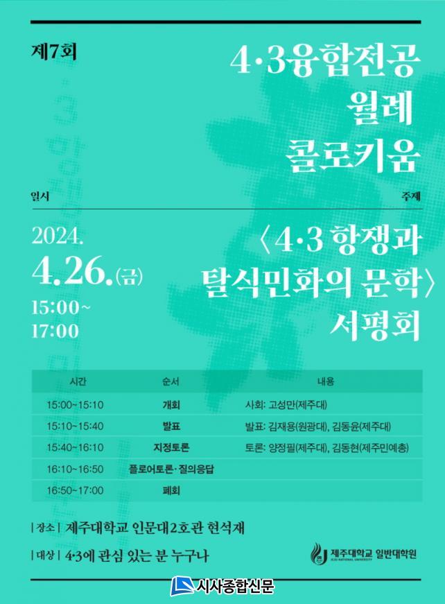 Àϰö ¹øÂ° 4¡¤3À¶ÇÕÀü°ø ¿ù·Ê ÄÝ·ÎŰ¿òÀº <4¡¤3Ç×Àï°ú Å»½Ä¹ÎÈÀÇ ¹®ÇÐ>ÀÇ °øµ¿ÀúÀÚÀÎ ¿ø±¤´ë ±èÀç¿ë ±³¼ö¿Í Á¦ÁÖ´ë ±èµ¿À± ±³¼öÀÇ ¹ßÇ¥¿Í ÇÔ²² Á¦ÁÖ´ë ¾çÁ¤ÇÊ ±³¼ö¿Í Á¦Áֹο¹ÃÑÀÇ ±èµ¿Çö ÀÌ»çÀåÀÇ Åä·ÐÀ¸·Î ÁøÇàµÈ´Ù.