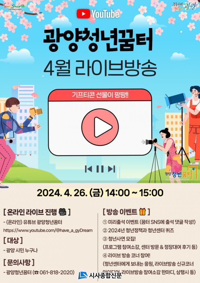 À̹ø ¶óÀÌºê ¹æ¼ÛÀº ¿À´Â 26ÀÏ ¿ÀÈÄ 2½ÃºÎÅÍ 3½Ã±îÁö 1½Ã°£ µ¿¾È ±¤¾çû³â²ÞÅÍ À¯Æ©ºê(www.youtube.com/@have_a_gyDream)¸¦ ÅëÇØ ÁøÇàµÇ¸ç ¡ã±¤¾çû³â²ÞÅÍ ¼Ò½Ä ¹× ´Ù¾çÇÑ Ã»³â Áö¿ø ½ÃÃ¥ ¾È³» ¡ã±¤¾çû³â²ÞÅÍ ¿î¿µ ÇÁ·Î±×·¥ ¼Ò°³ ¡ã±¤¾ç½Ã û³âµéÀÇ Æ¯º°ÇÑ »ç¿¬À» ¼Ò°³ÇÒ ¿¹Á¤ÀÌ´Ù.