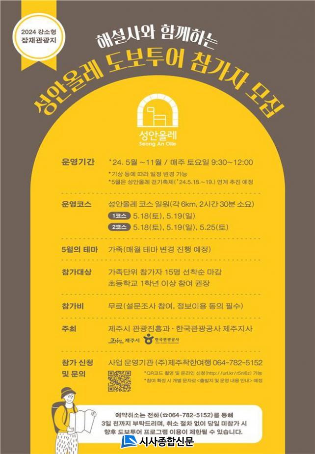 | Á¦ÁÖ½Ã, ¼º¾È¿Ã·¹ µµº¸ Åõ¾î ÇÁ·Î±×·¥ ¿î¿µ 5¿ùºÎÅÍ 11¿ù±îÁö ÇØ¼³»ç¿Í ÇÔ²² ÃÑ 28ȸ ÁøÇà, ¿©¸§ ¾ß°£ ÇÁ·Î±×·¥µµ ¿î¿µ