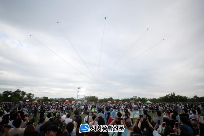 Ưº°À̺¥Æ®·Î ¸¶·ÃÇÑ ´ëÇѹα¹ °ø±º Ư¼öºñÇàÆÀ ¡®ºí·¢À̱۽º¡¯ÀÇ ¿¡¾î¼î´Â À̹ø ÃàÁ¦ ¶Ç ÇϳªÀÇ ¡®ÇÏÀ̶óÀÌÆ®¡¯¿´´Ù. ±¹»ê ÃÊÀ½¼Ó Ç×°ø±â T-50B 8´ë·Î ±¸¼ºµÈ ºí·¢À̱۽º°¡ °íµµÀÇ °á¼Ó·ÂÀ» ¹ÙÅÁÀ¸·Î È·ÁÇϰí Çö¶õÇÑ Æ¯¼öºñÇàÀ» ¼±º¸ÀÎ 15ºÐ°£ ÇöÀåÀÇ ¸ðµÎ°¡ Çϴÿ¡ ½Ã¼±À» °íÁ¤ÇÑ Ã¤ ´«À» ¶¼Áö ¸øÇß´Ù. À§Ç³´ç´çÇÑ ±âµ¿°ú ³î¶ó¿î °î¿¹¿¡ °¨Åº°ú ź¼ºÀÌ °è¼ÓµÈ °¡¿îµ¥, ºí·¢À̱۽º°¡ ±¤»ê Çϴÿ¡ űر⸦ ±×¸° ¼ø°£¿¡´Â Å« ȯȣ¿Í ¹Ú¼ö°¡ ½ñ¾ÆÁ³´Ù.