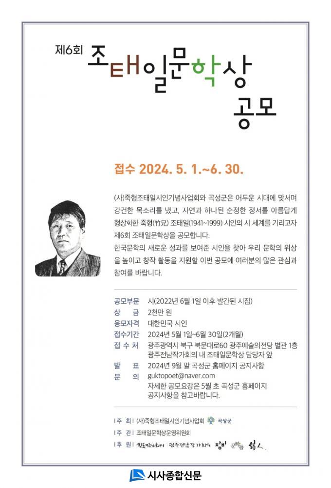 (»ç)Á×ÇüÁ¶ÅÂÀϽÃÀαâ³ä»ç¾÷ȸ(ÀÌ»çÀå ¹Ú¼®¹«)¿Í °î¼º±º(±º¼ö ÀÌ»óö)ÀÌ ÁÖÃÖÇϰí, Çѱ¹ÀÛ°¡È¸ÀÇ, ±¤ÁÖÀü³²ÀÛ°¡È¸ÀÇ, âºñ, ¹®ÇеéÀÌ ÈÄ¿øÇÏ´Â <Á¦6ȸ Á¶ÅÂÀϹ®Çлó> Á¢¼ö ±â°£Àº 5¿ù 1ÀϺÎÅÍ 6¿ù 30ÀϱîÁö 2°³¿ù°£À̸ç, ÃÖ±Ù 2³â À̳»(2022³â 6¿ù 1ÀÏ ÀÌÈÄ)¿¡ ¹ß°£ÇÑ ½ÃÁýÀ» ½ÃÀÎ º»ÀÎÀÌ Á¦ÃâÇϰųª ÃßõÀ§¿øÀÇ ÃßõÀ» ÅëÇØ ÀÀ¸ðÇÒ ¼ö ÀÖ´Ù. ½Ã»ó½ÄÀº ¿À´Â 10¿ù °î¼º Á¶ÅÂÀϽù®Çбâ³ä°ü¿¡¼ ÆîÃÄÁú Á¶ÅÂÀÏ ½ÃÀÎ 25Áֱ⠹®ÇÐ ÃàÀü¿¡¼ ¿¸®¸ç, »ó±ÝÀº 2õ¸¸ ¿øÀÌ´Ù.