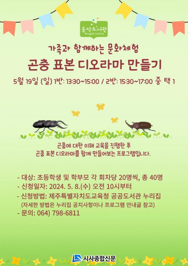 ¢ß´öõ°ïÃæ¿µ³óÁ¶ÇÕ ¼Ò¼Ó °û°æÅ¹ °»ç°¡ ÁøÇàÇÏ´Â °¡Á·°ú ÇÔ²²ÇÏ´Â ¹®ÈüÇè¡°°ïÃæ Ç¥º» µð¿À¶ó¸¶ ¸¸µé±â¡±´Â 5¿ù 19ÀÏ(ÀÏ) 13:30~15:00, 15:30~17:00 ÃÑ 2ȸ·Î ÀÌ·ç¾îÁö¸ç, 5¿ù 8ÀÏ(¼ö) ¿ÀÀü 10½ÃºÎÅÍ Á¦ÁÖÆ¯º°ÀÚÄ¡µµ±³À°Ã» °ø°øµµ¼°ü ´©¸®Áý(https://org.jje.go.kr/lib)¿¡¼ ¼±Âø¼øÀ¸·Î ¸ðÁýÇÒ ¿¹Á¤ÀÌ´Ù.
