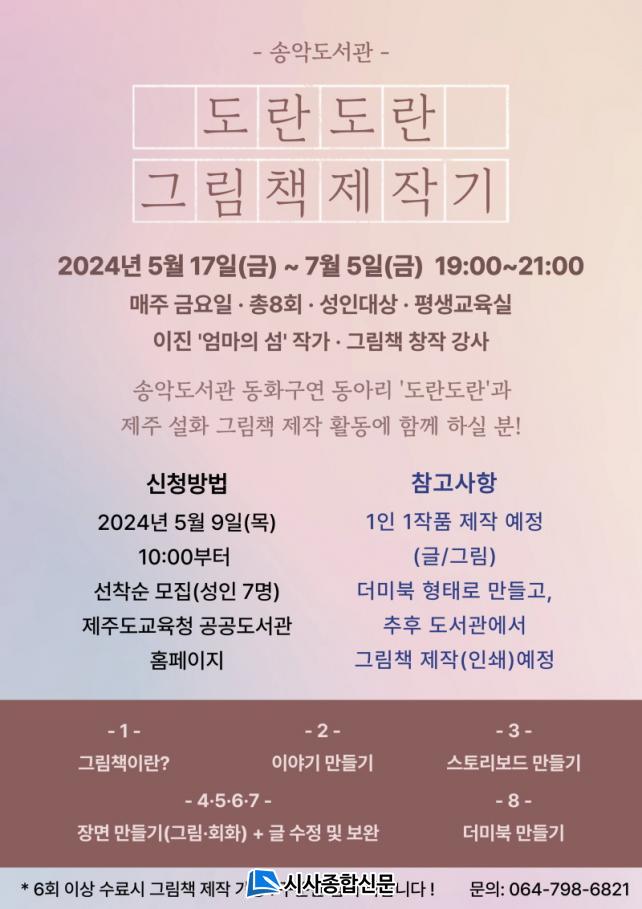 5¿ù 17ÀÏ(±Ý)ºÎÅÍ 8ÁÖ°£ ¸ÅÁÖ ±Ý¿äÀÏ Àú³á 19:00~21:00¿¡ ÇÁ·Î±×·¥À» ÁøÇàÇÒ ¿¹Á¤À̸ç 5¿ù 9ÀÏ(¸ñ) 10:00ºÎÅÍ Á¦ÁÖµµ±³À°Ã» °ø°øµµ¼°ü ´©¸®Áý(ȨÆäÀÌÁö)¿¡¼ »çÀü ½Åû¹Þ´Â´Ù.