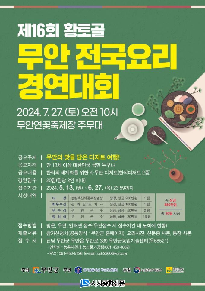À̹ø ´ëȸ´Â¡®¹«¾ÈÀÇ ¸ÀÀ» ´ãÀº µðÀúÆ® ¿©Çà!¡¯À̶ó´Â ÁÖÁ¦·Î, ¸¸ 13¼¼ ÀÌ»ó ´ëÇѹα¹ ±¹¹Î ´©±¸³ª Âü¿©ÇÒ ¼ö ÀÖÀ¸¸ç ¹«¾È³óƯ»ê¹°ÀÎ °í±¸¸¶, ¾çÆÄ, ¿¬, ¹ãÈ£¹Ú µîÀ» ÀÌ¿ëÇÑ ¿ä¸®°æ¿¬À¸·Î 1Â÷ ¼·ù½É»ç(7¿ù 5ÀÏ)¸¦ Åë°úÇÑ Âü°¡ÀÚ 20ÆÀÀº 7¿ù 27ÀÏ ¿¬²ÉÃàÁ¦Àå ÁÖ¹«´ë¿¡¼ ¿ÀÀü 10½ÃºÎÅÍ ¿ÀÈÄ 3½Ã±îÁö ÇöÀå°æ¿¬´ëȸ¸¦ Ä¡¸£°Ô µÈ´Ù.