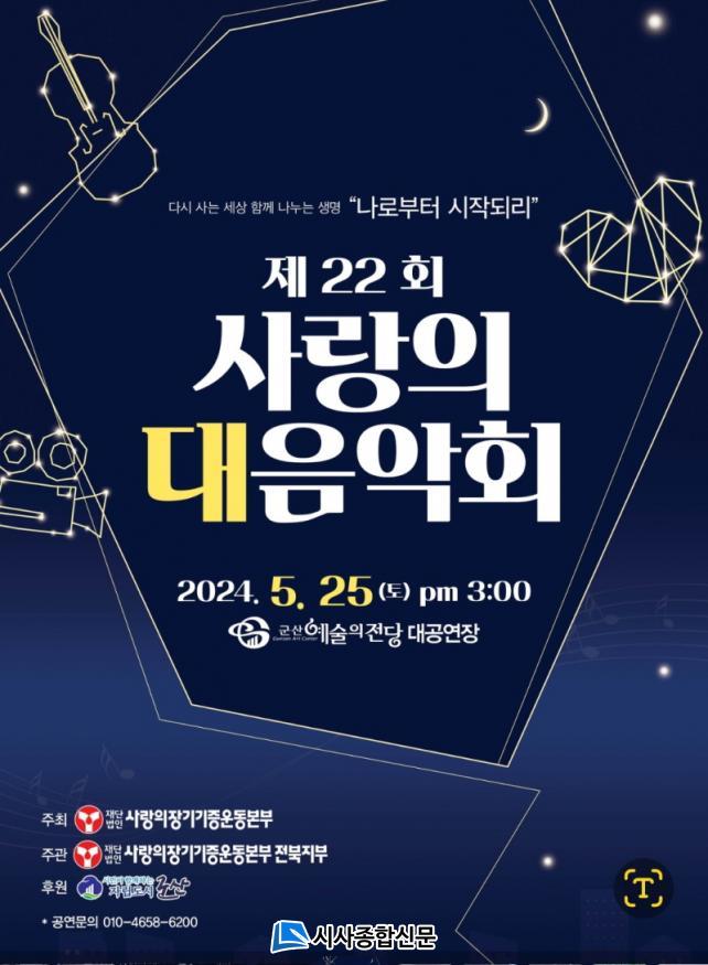 Á¦22ȸ »ç¶ûÀÇ ´ëÀ½¾Çȸ´Â ½ÄÀü Çà»ç·Î Àå±â±âÁõ °ü·Ã À¯°øÀÚ ½Ã»ó µîÀÌ ÀÌ·ç¾îÁö¸ç, À½¾Çȸ °ø¿¬Àº ¿µ»ó¹°, ¼º¾Ç(µ¶Ã¢, ÇÕâ)°ú ±â¾Ç µîÀ¸·Î ±¸¼ºµÇ¾î ÀÖ°í, ´çÀÏ ÇöÀå¿¡¼ Àå±â±âÁõ Èñ¸Á µî·Ï ¹× ÈÄ¿ø¿¡µµ Âü¿©ÇÒ ¼ö ÀÖ´Ù.